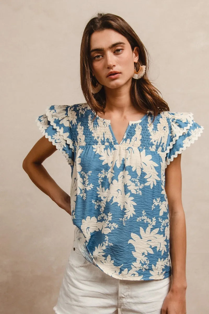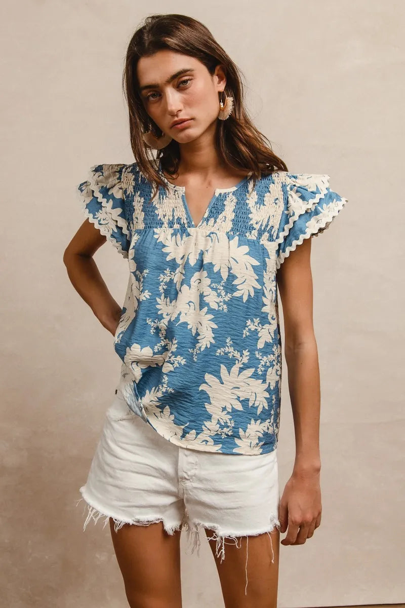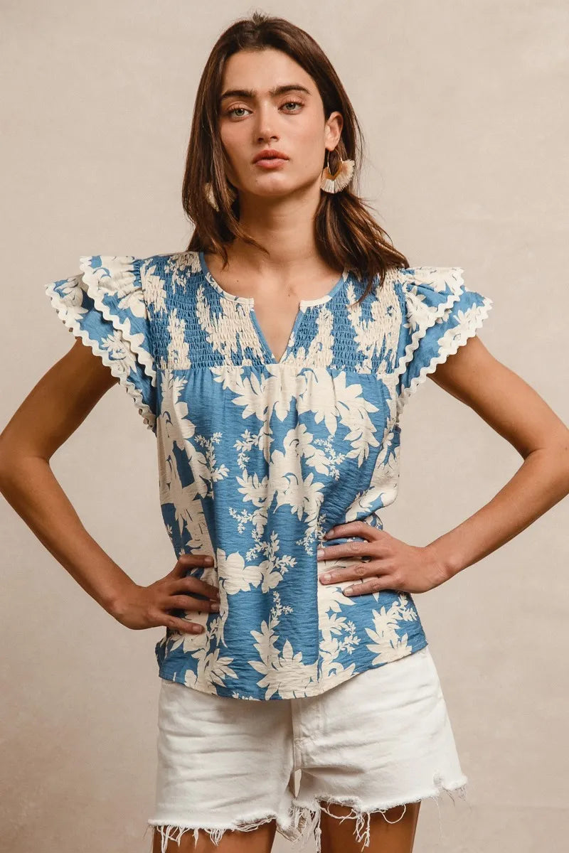 BiBi Floral Prints Wave Trim Smocking Details Short Sleeve Blouse